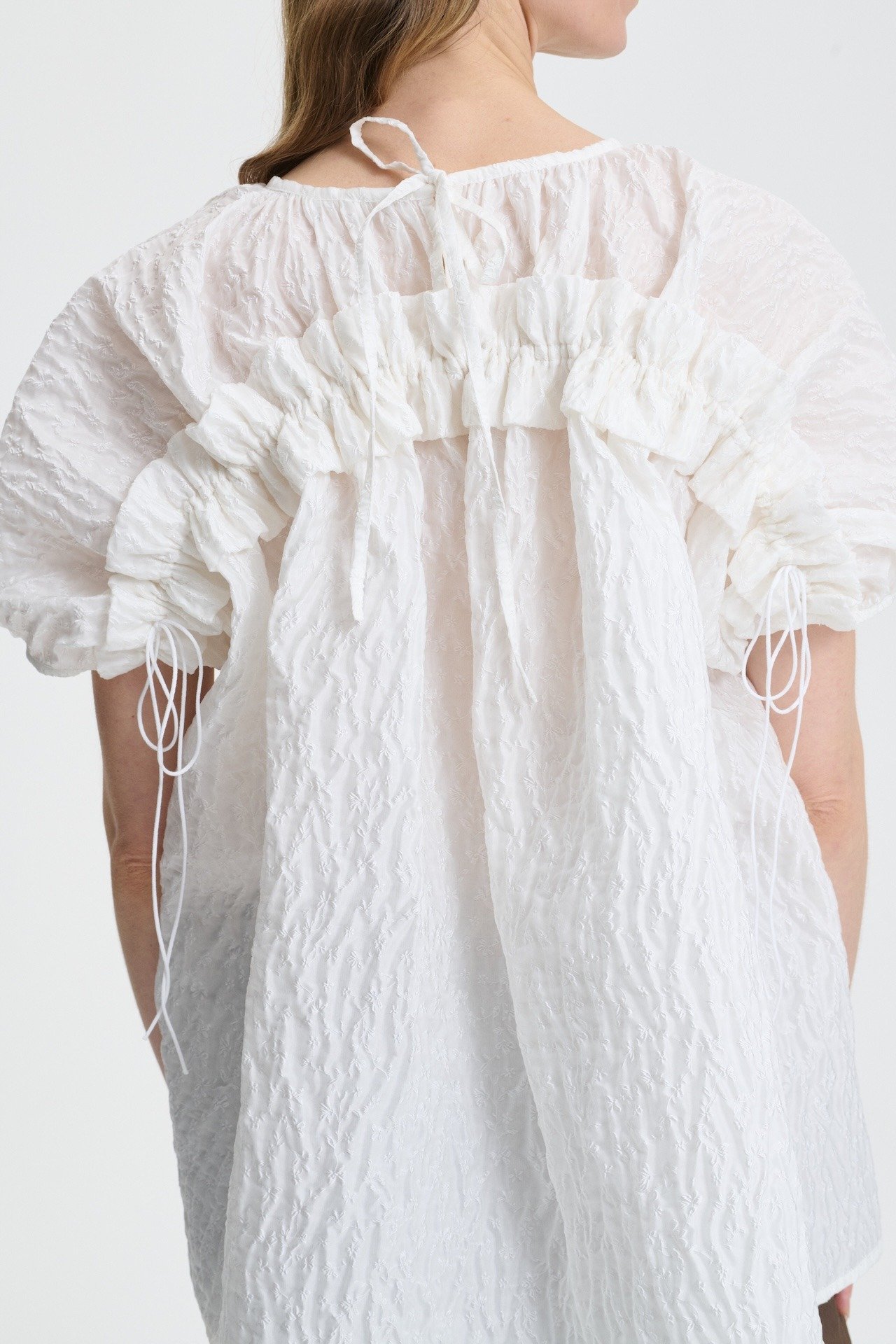 Ethereal and cloud-like, the Bellarose top. Crafted from a floral-detailed lobelia matelassé, the blouse offers architectural volumes at the front, while ruched ruffles run across the back, pulled together by wisp-thin ribbons. Complete with a bow tie closure.