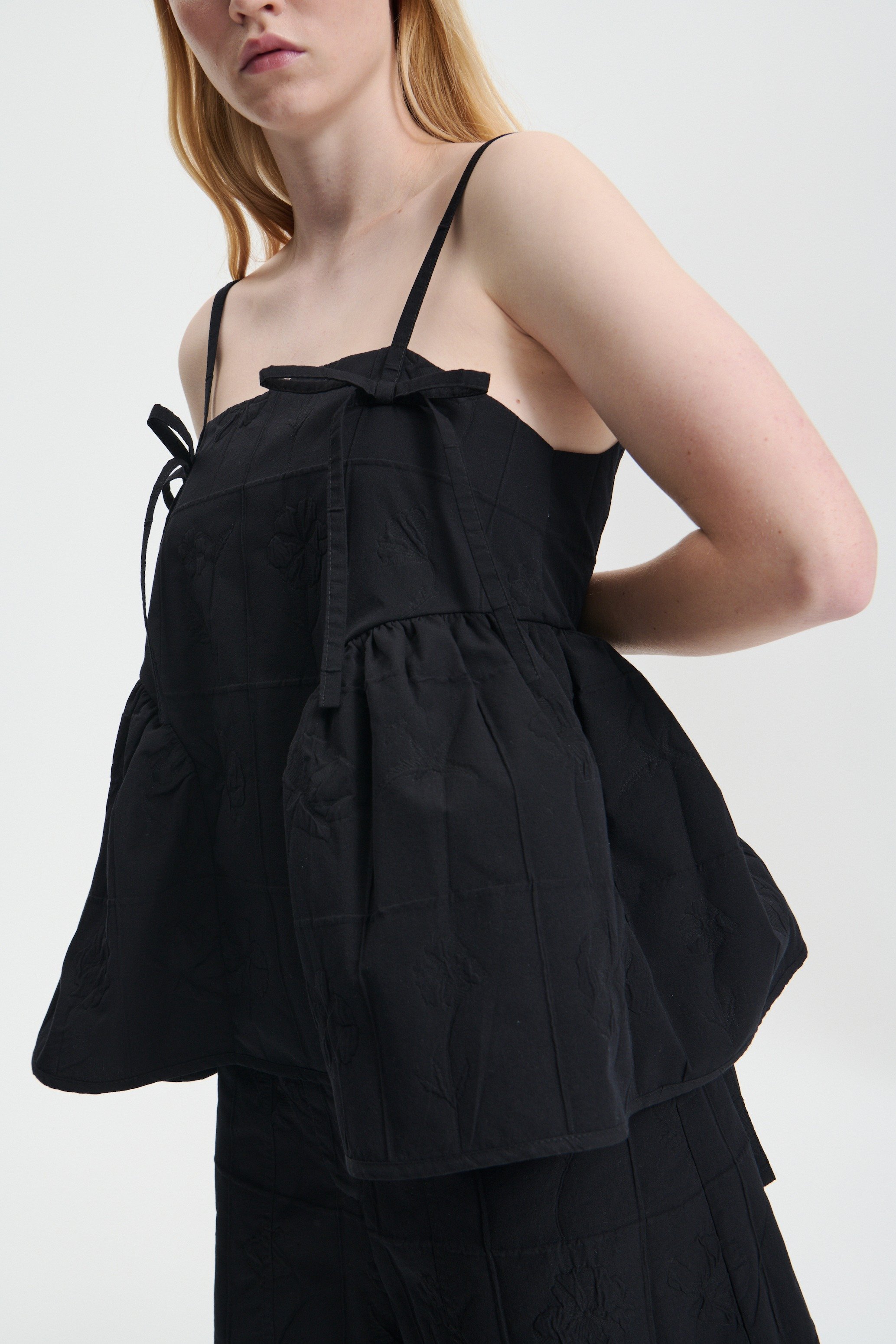 A romantic essential, the Akira top. Recognizable as Cecilie Bahnsen's through gathered hip panels and an open back tied with a bow closure, the shift top is held up with bow detailed straps. Cut from a floral matelassé, the straight neckline offers a touch of simplicity to an otherwise intricate piece.