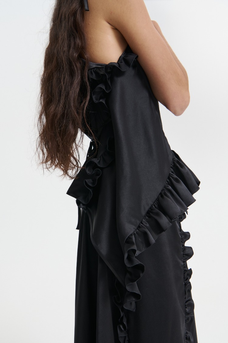 Alessandra toppen, et asymmetrisk udtryk for romantik. Skåret af sort silkesatin, et spil af flæser og elementer af couture-teknikker, der passer sammen. Holdt op af sarte stropper og trukket på tværs af signaturbånd, afsluttet med en blød peplum-kant.