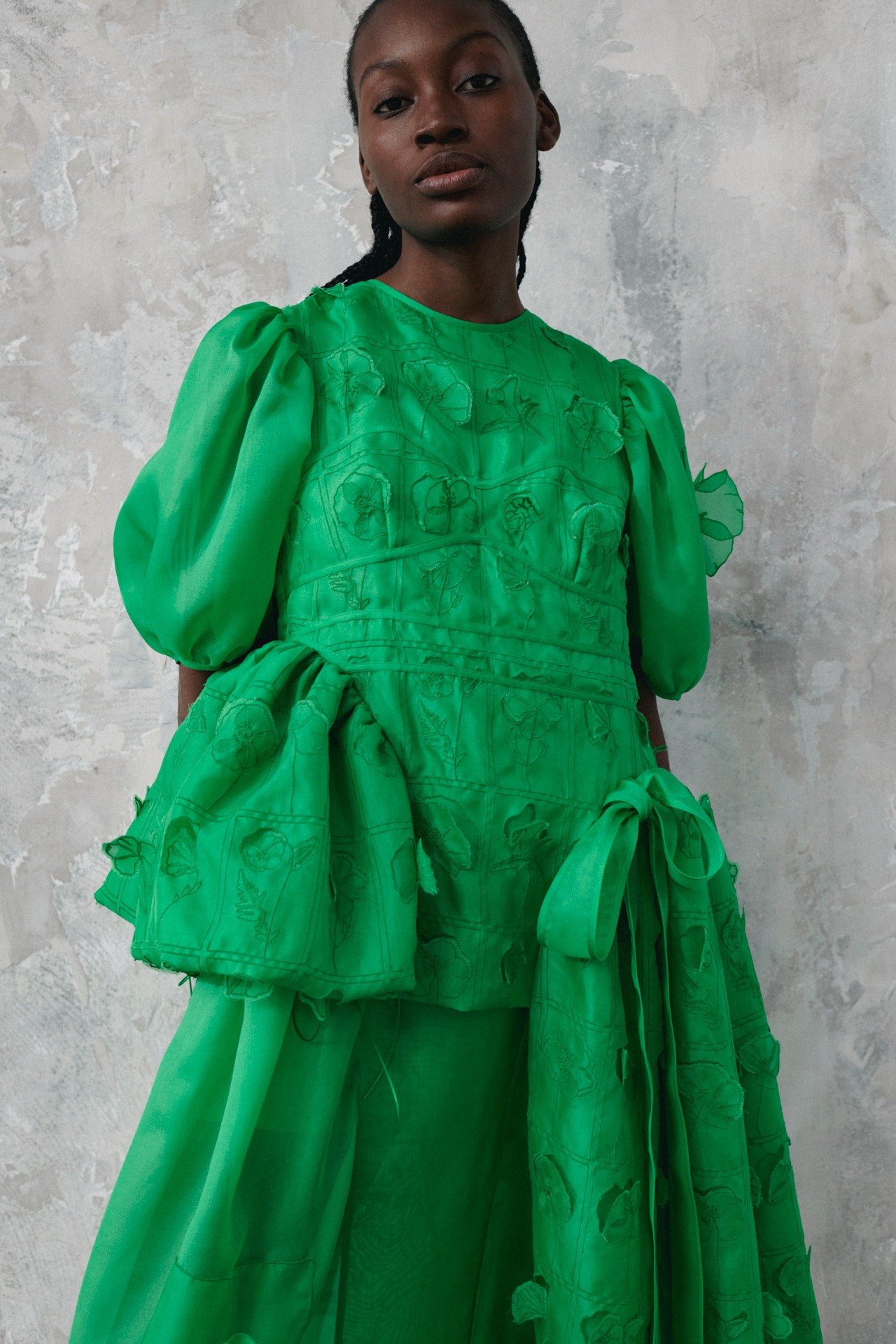 Dolores Overlay, et lagdelt stykke til at bygge ind i enhver dressing lejlighed. En sammensætning af smaragdgrønne blomster, der danser langs overfladen af den bustiere silhuet og falder over i en asymmetrisk nederdel, der falder til anklen på den ene side. Suppleret med feminine pufærmer, lukket med sløjfer, der krydser hinanden i ryggen.