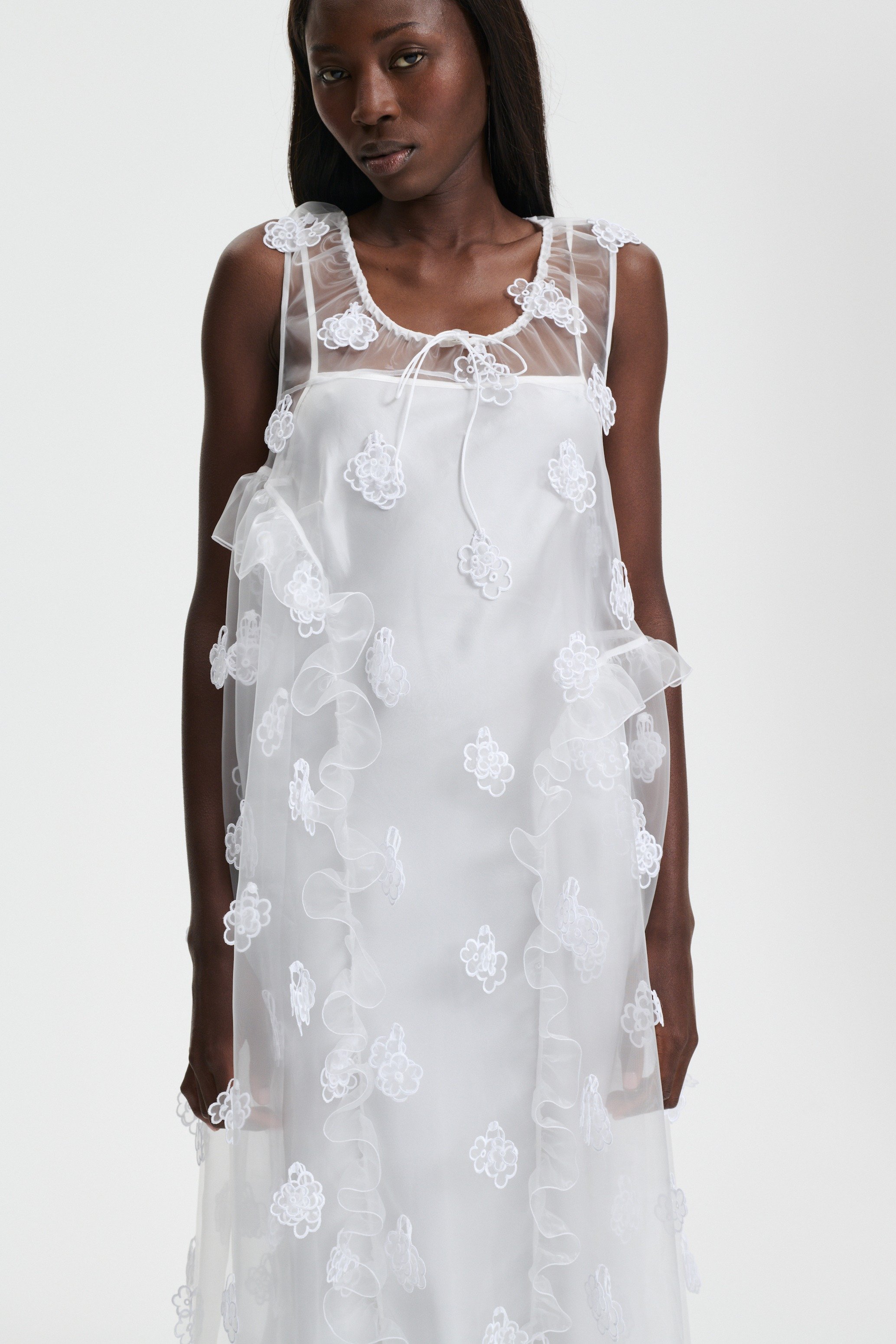 Kære og drømmende, Opal-kjolen. Et nyt bud på skiftekjolen, skåret af hvid flydende organza, prydet med blomsterkiki-broderi. Dette bestillingsstykke er udsmykket med en rystende historie og flæser i hoftepaneler. En nem silhuet trukket sammen af tynde bånd. Bemærk venligst, at kjolen vil være foret.