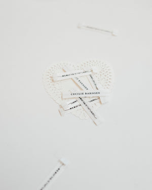 At Cecilie Bahnsen, our approach to responsibility is a personal one, shaped by genuine beliefs and dreams. Although the path to responsibility is imperfect, every action, big or small, makes a difference. While we acknowledge that the products we put out have an impact on the environment, we strive to reduce their effect. As our universe evolves, we want our knowledge and transparency to evolve with it, building a traceable value chain, knowing all the people and places we have touched. We are dedicated to working with craftspeople in Europe to preserve the beauty of century old traditions and techniques, bringing the intricate details of couture into the every-day. Creating clothes to cherish, to keep, to share, to lend, to pass on.