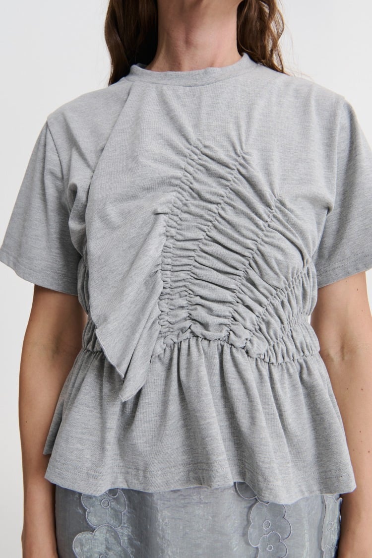 A t-shirt that could only be Cecilie Bahnsen is, the Ace top. Cut from a grey mÈlange jersey, elevated by ruching across the back and front, defining the waist before blooming out to a soft peplum. A signature ruffle extends across the chest for additional romance.