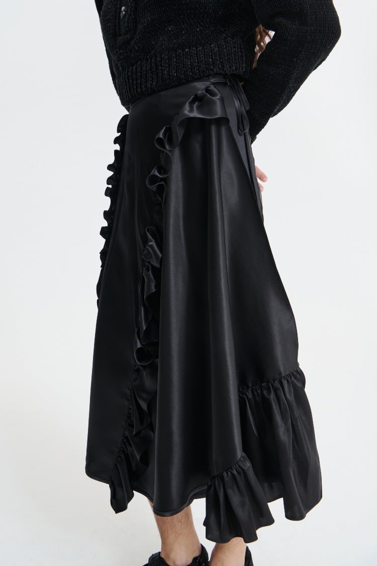 The Adelina skirt, with its soft ruffles and light transparencies. Crafted from a black silk satin, the A-line silhouette flows just below the knee. Made to move in with ease, elevating the everyday.