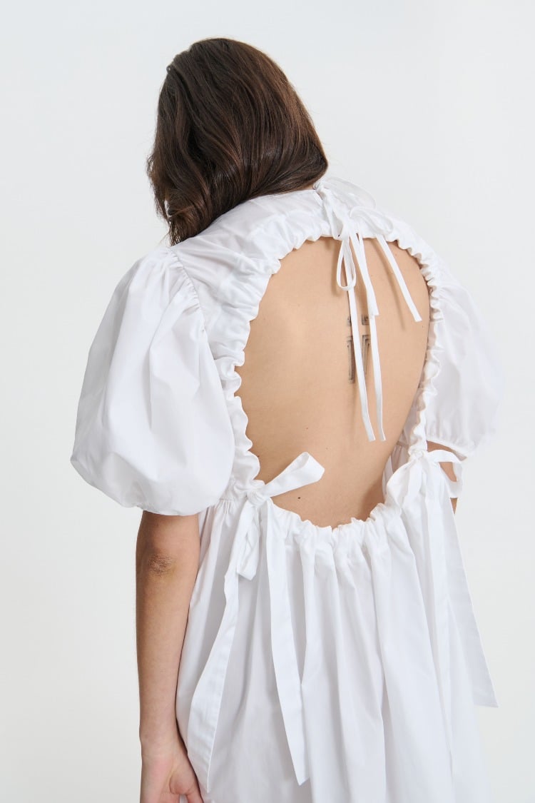 With a dramatic open back and bow detailing, the Ailey dress is a play of simplicity and romance. Voluminous puff sleeves meet an airy skirt, crafted from white/pine green cotton for everyday wear. A silhouette that is unmistakably Cecilie Bahnsen.
