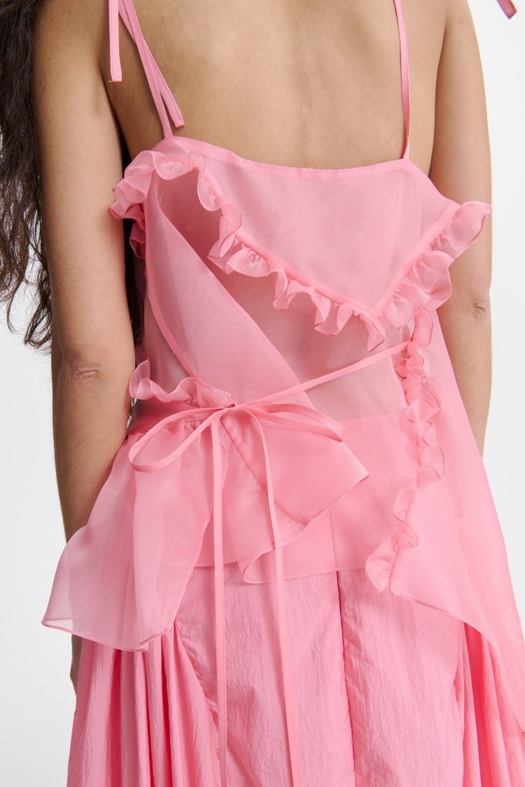 The Alessandra top, an asymmetrical expression of romance. Cut from a sorbet satin organza, a play of ruffles and elements of couture techniques coming together. Held up by delicate straps and pulled across by signature ribbons, finished with a soft peplum hem.