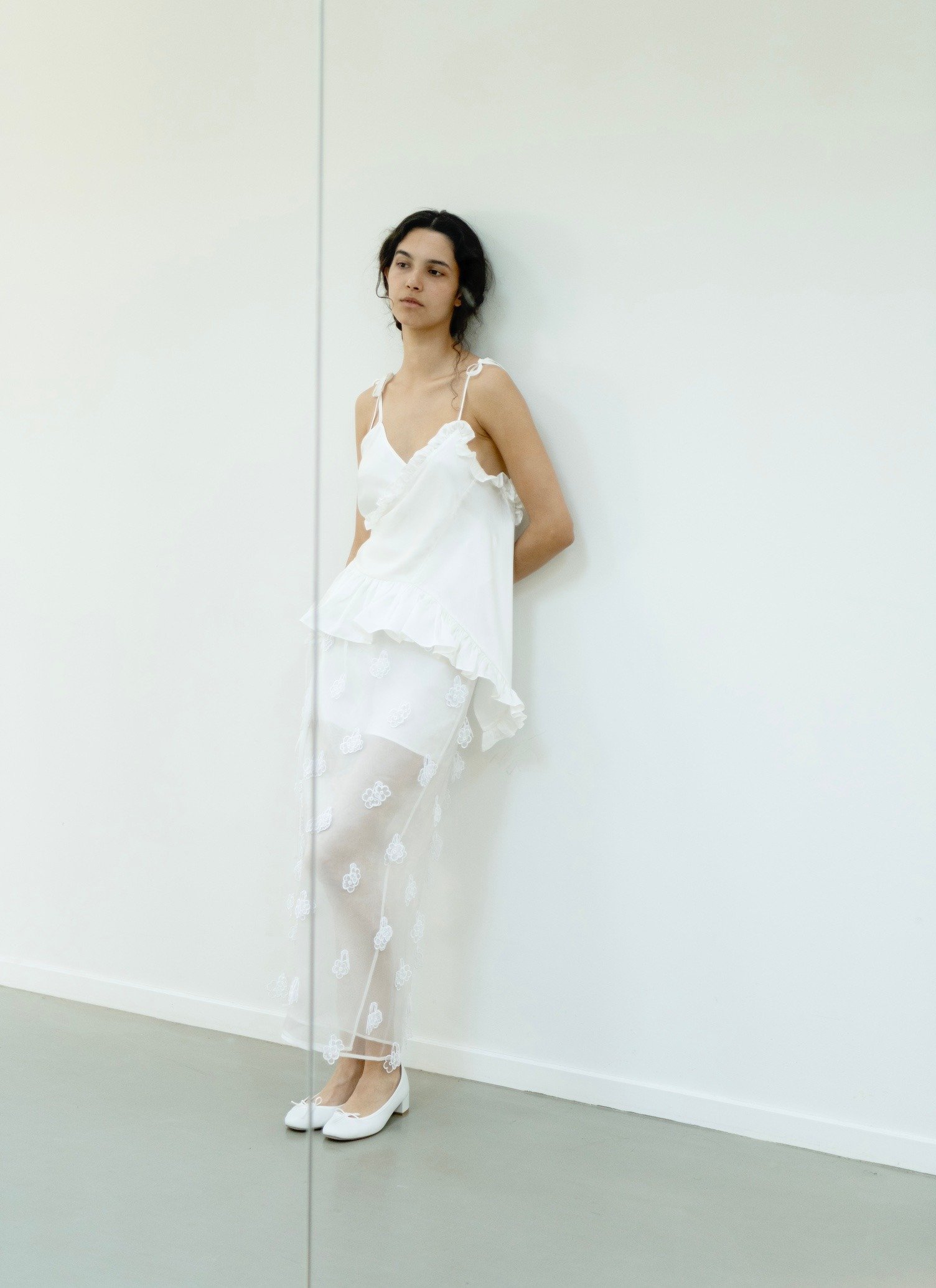 The Alessandra top, an asymmetrical expression of romance. Cut from an exclusive white silk satin, a play of ruffles and elements of couture techniques coming together. Held up by delicate straps and pulled across by signature ribbons, finished with a soft peplum hem. Only available on ceciliebahnsen.com