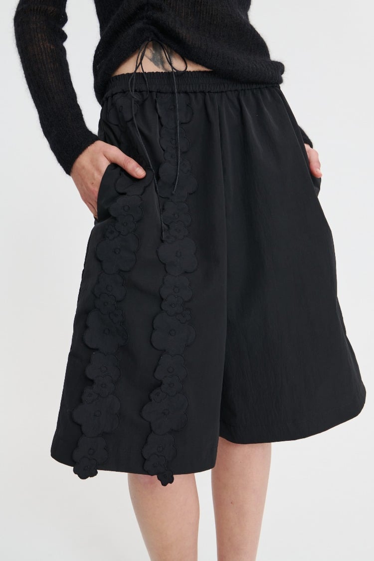 Fusing masculine and feminine codes, the Angel shorts. Cut from black/chestnut recycled taffeta, the utilitarian fabric and oversized silhouette provides a unique structure, while floral dècoupès bring in a subtle element of romance.