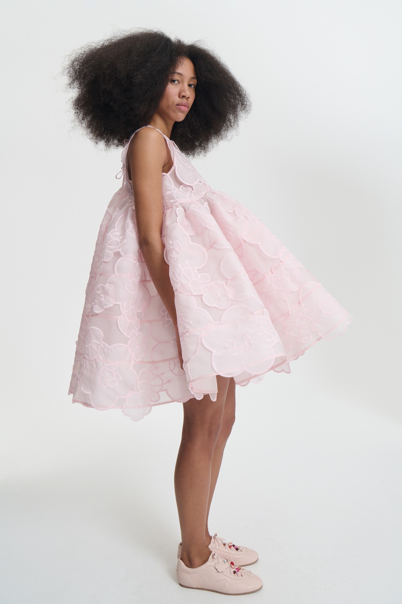 An expression of Cecilie Bahnsen’s innovative couture construction, the Bellatrix dress. Brought to life from an embroidered liquid myrtia, crinoline and 65 floral appliqués embellish the sculptural silhouette to takes her exploration of volume to new levels. A showstopping piece that is unapologetically feminine.