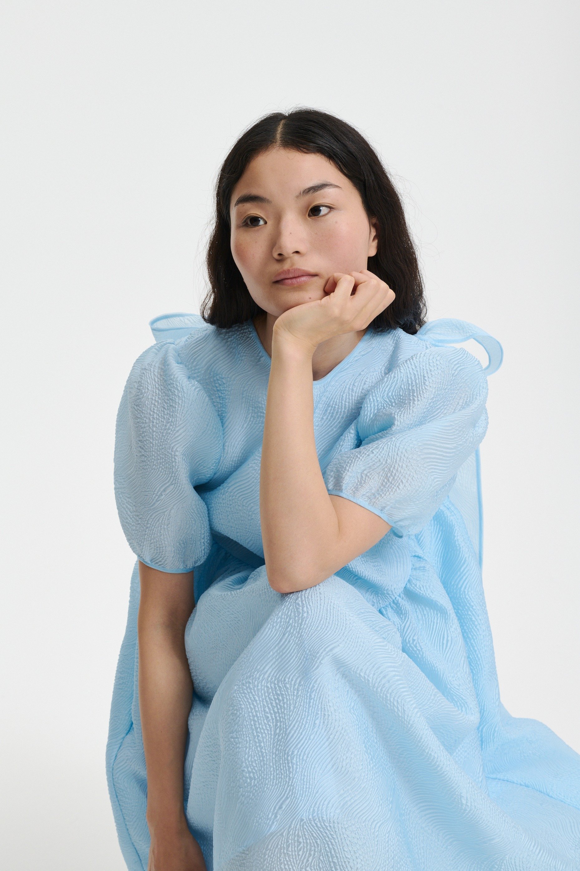 Girlish and airy, the Bernadette dress is a classic silhouette by Cecilie Bahnsen. Crafted from a Kaze matelassé, the shifty bodice with a rounded neckline flows into an easy knee-length skirt, fully lined for ease of wear. Lightweight puff sleeves imbue the piece with a signature touch. At the back, three delicate bows and overlaid with two larger ones.