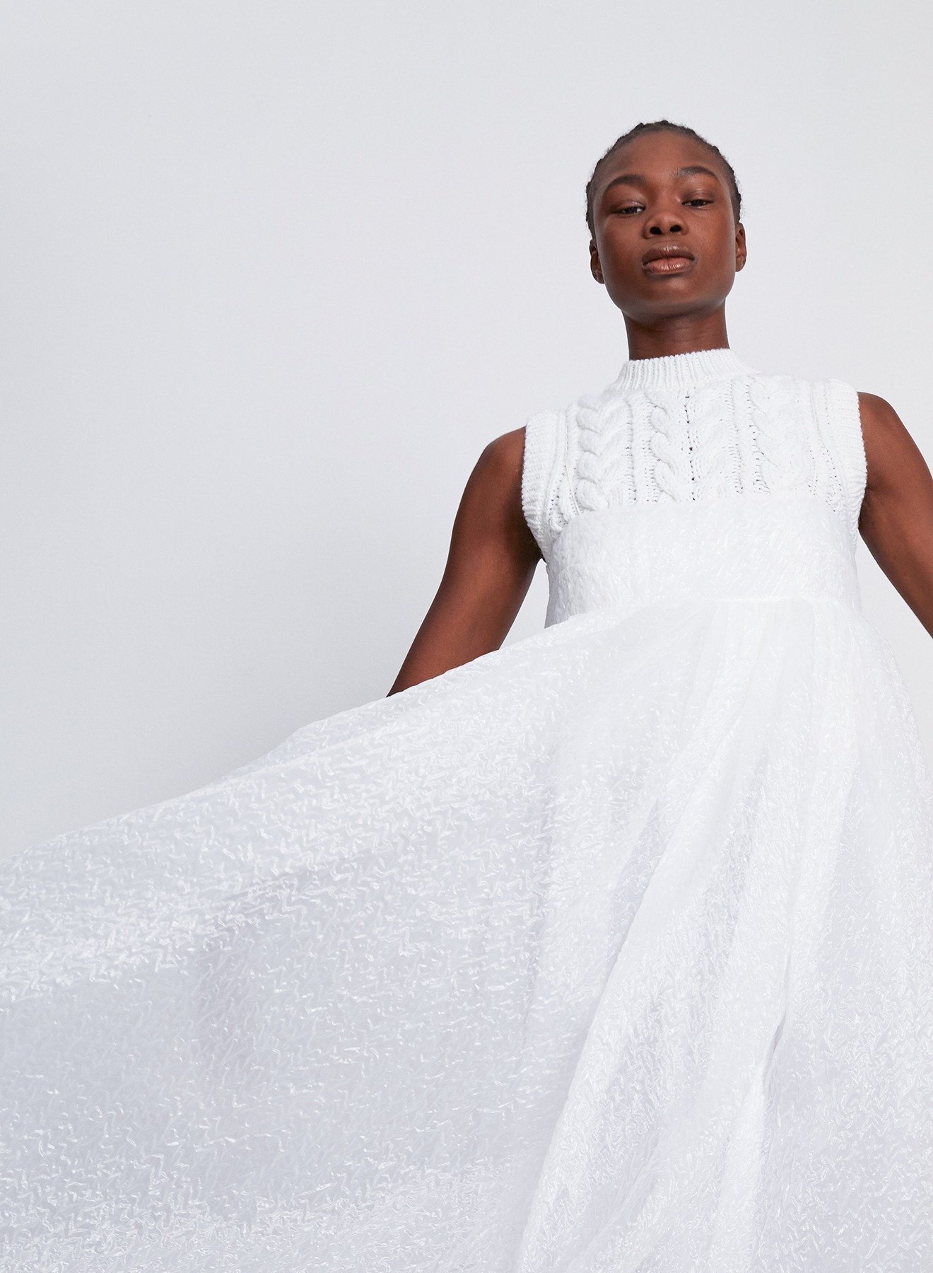 Expressing Cecile Bahnsen's appreciation for couture fabric, the Beth is crafted in Alp Matelassé in Clear. The minimalist silhouette balances a narrow bandeau with a voluminous skirt that falls to the ankle.