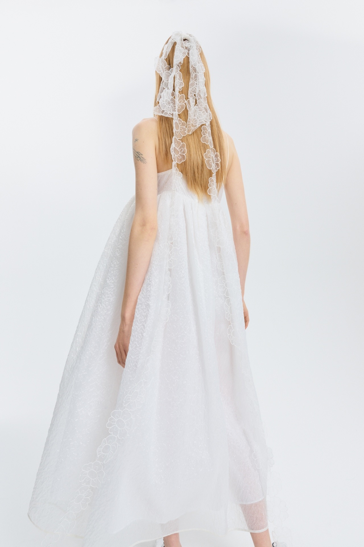 Expressing Cecile Bahnsen's appreciation for couture fabric, the Beth is crafted in Alp Matelassé in Clear. The minimalist silhouette balances a narrow bandeau with a voluminous skirt that falls to the ankle.