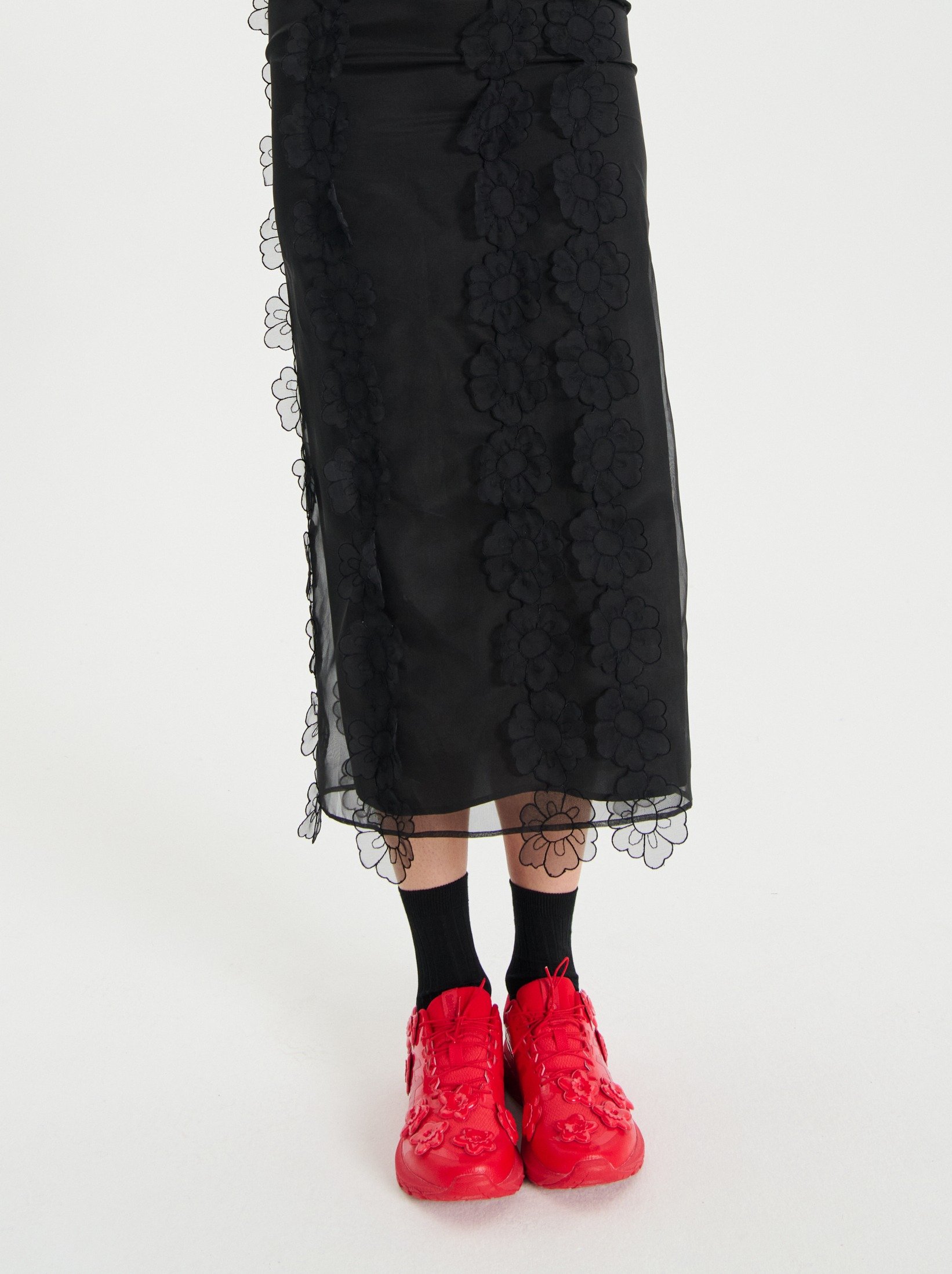 Working with the Gel-Terrain model, the trainer lays on the GT 2000 8 base, providing stability and support while maintaining a lightweight feel. The construction features a ripstop mesh upper, with padded 3D flowers scattered across the shoeís surface. A glossy finish contrasts the delicacy of signature florals, while a monochromatic colour palette creates a sleek, elevated feeling. The lacing system uses a technical speed lacing construction, made ultra-feminine through a bespoke, floral puller piece. Debuted on Bahnsenís Fall Winter 2024 runway show at Paris Fashion Week, the latest launch offers her signature feminine interpretation of ASICSí Gel-Terrain sneakers, presented in three colourways.