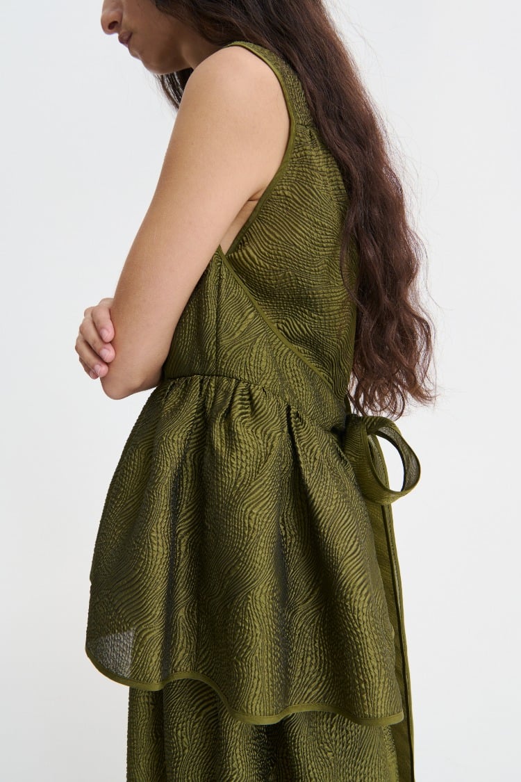 Fusing simplicity with couture, the Ea top. Displaying her admiration for traditional techniques, Cecilie Bahnsen's bespoke olive kaze matelassé is an expression of couture know-how. The structural, peplum silhouette is softened at the back by a dramatic bow that pulls the look together.