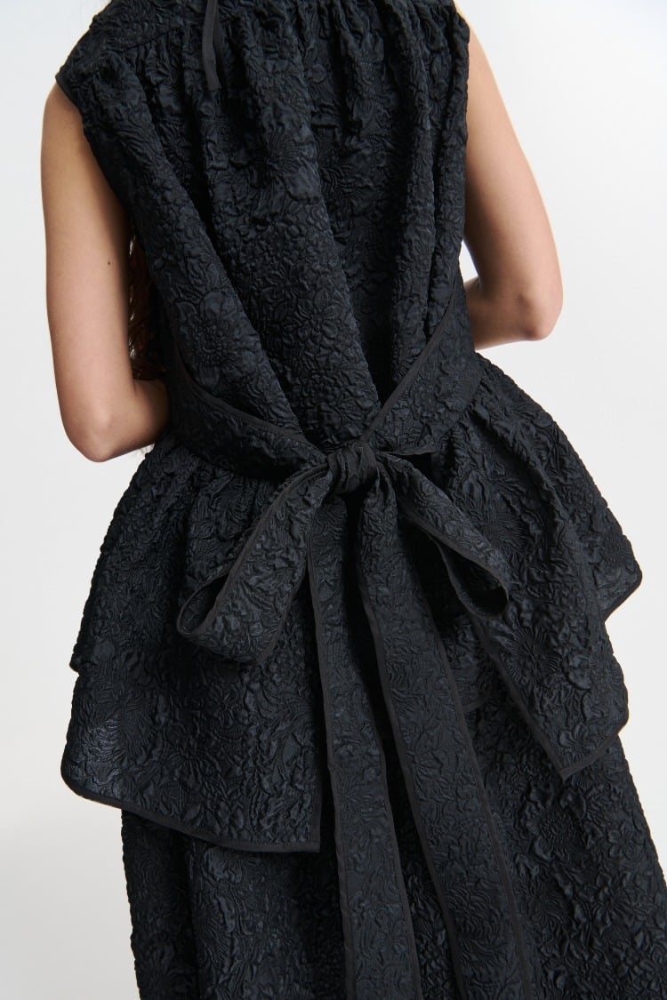 Fusing simplicity with couture, the Ea top. Displaying her admiration for traditional techniques, Cecilie Bahnsen's bespoke borage cloqué is an expression of couture know-how. The structural, peplum silhouette is softened at the back by a dramatic bow that pulls the look together.
