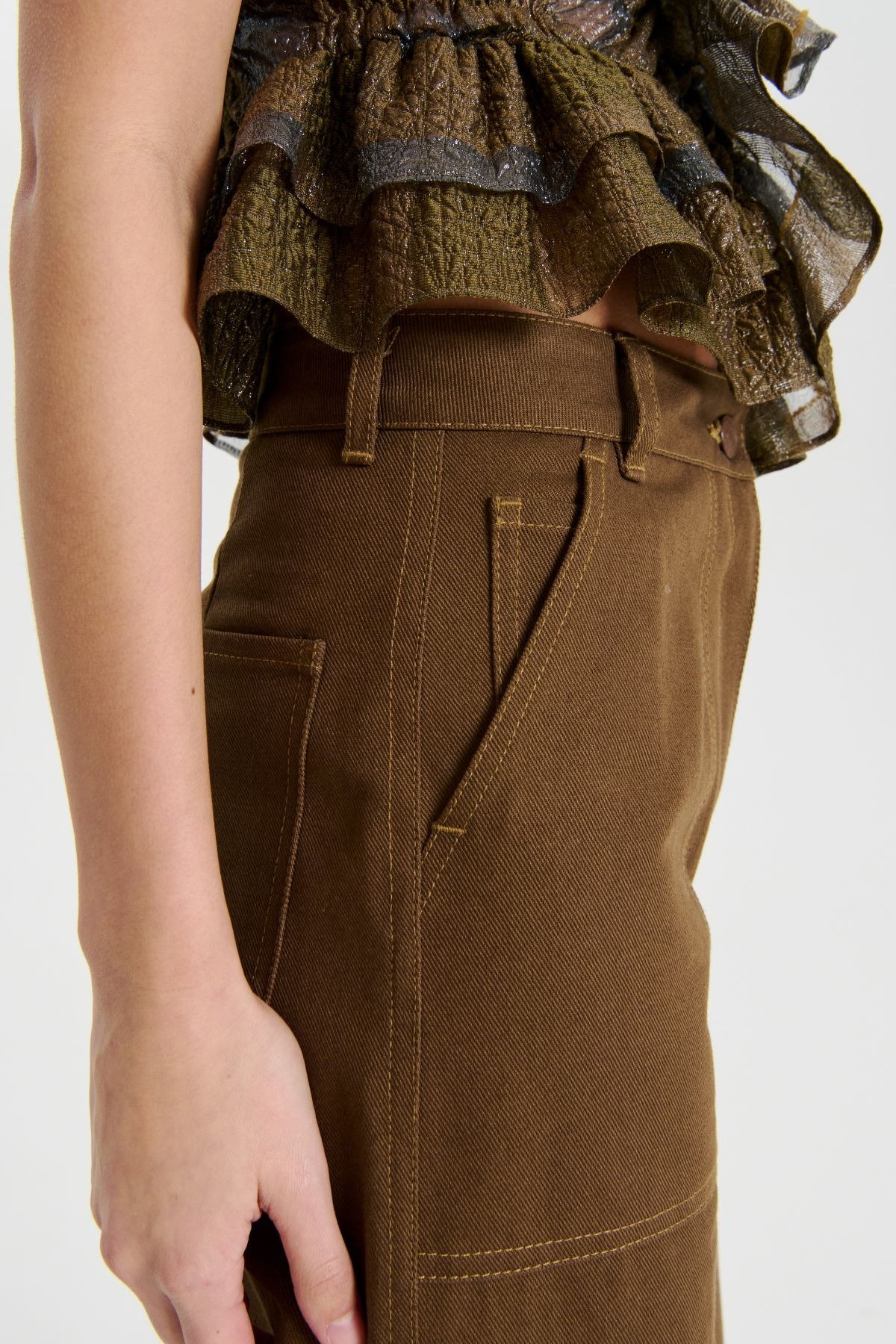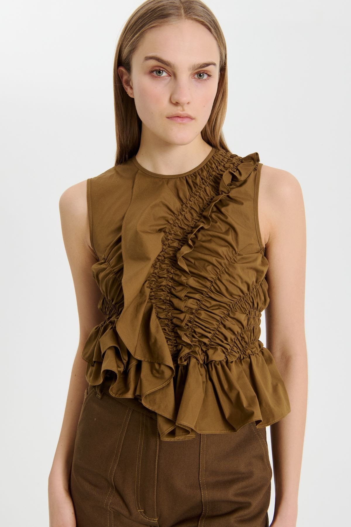 A story of ruffles, the Geo top. An asymmetrical ruching of light brown cotton extends romance across the body, emerging in unexpected puckers and lines. The sleeveless silhouette and cropped waist channel a modern yet girlish feel, complete with airy ruffles that run down the spine, tied with a bow.