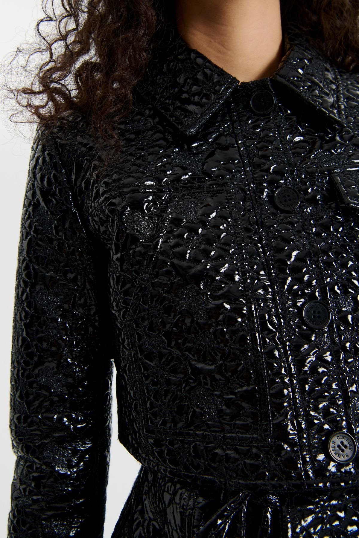Cecilie Bahnsen offers a new take on her masculine counterpoint to her ultra-feminine universe with the black Gracie jacket. Cut from laccatta floral quilt, the cropped, boxy silhouette is made to pair seamlessly with the rest of her offerings. Utilitarian notions blend with romance as the glossy fabric evokes rain-slicked florals.
