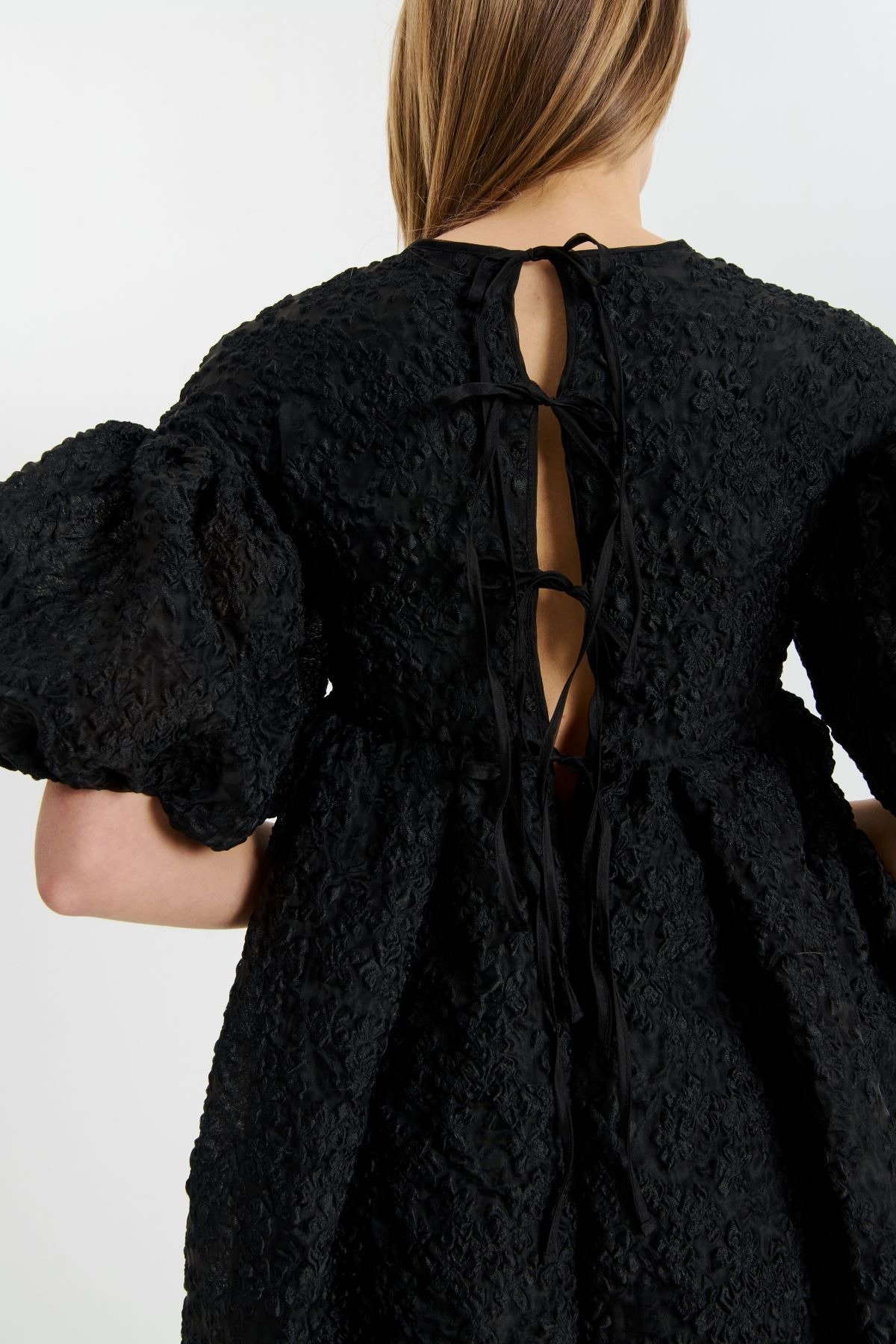 The ultra-feminine Jeanne dress is crafted in an ethereal grasmere matelassé. The lightweight yet elegant silhouette features a voluminous floating length, bracelet sleeves, and a tulip skirt enclosed with delicate bow ties down the back.