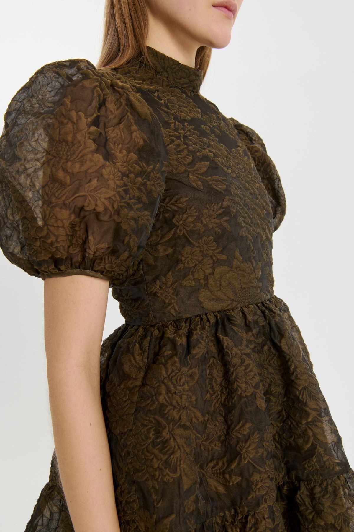 Embodying distinct Cecilie Bahnsen signatures, the Kelly Dress. A composition of romantic volume, the dress features a high bodice, falling into a tiered skirt. Finished with puff sleeves and a high neckline. Crafted from a brown posy matelassÈ, an embodiment of illusory textures and a bespoke sensibility. Finished with zip closure.