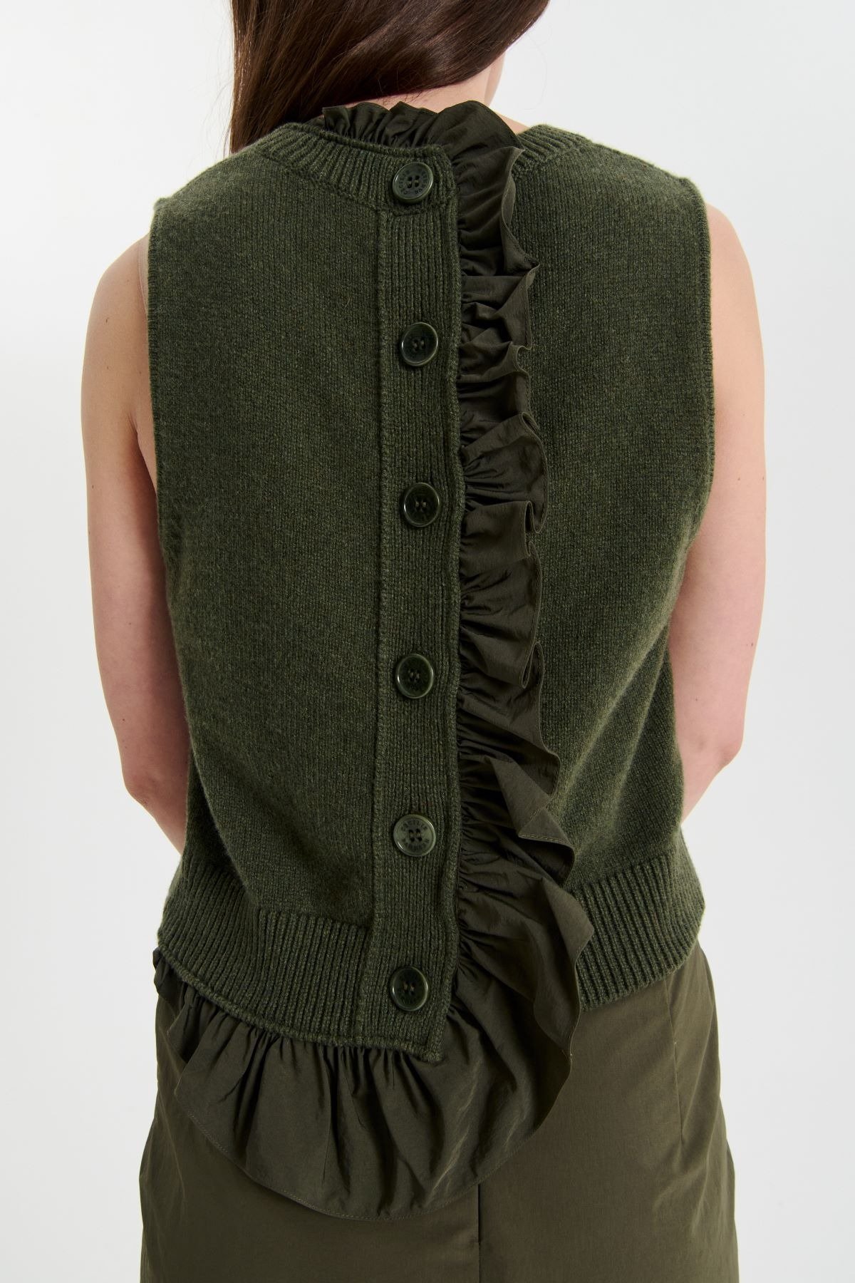 A streamlined silhouette that reveals its romance in the back, the Olivier vest. An organza ruffle runs down the spine of the sleeveless design, taking the vest from simplicity to everyday couture. Knit from grey olive recycled cashmere for a soft and warm feel.