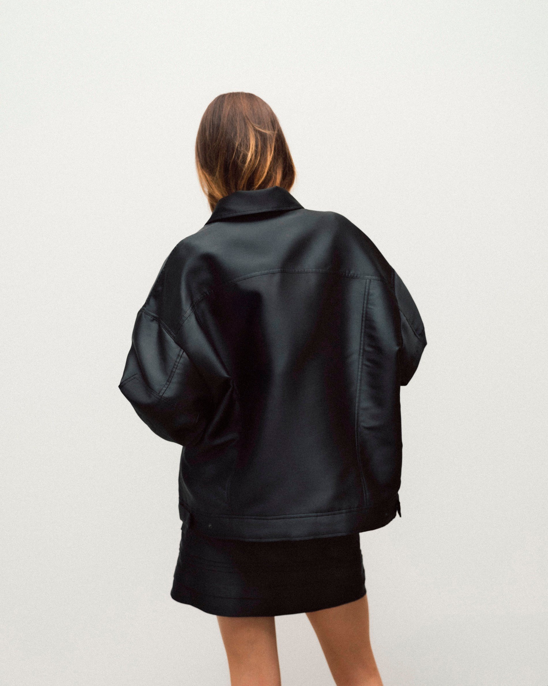 The Olpa jacket, a piece that brings showcases technical fabrication and modern femininity. Cut from an black Lustre Twill. Imbuing the everyday with a light and practical feel.