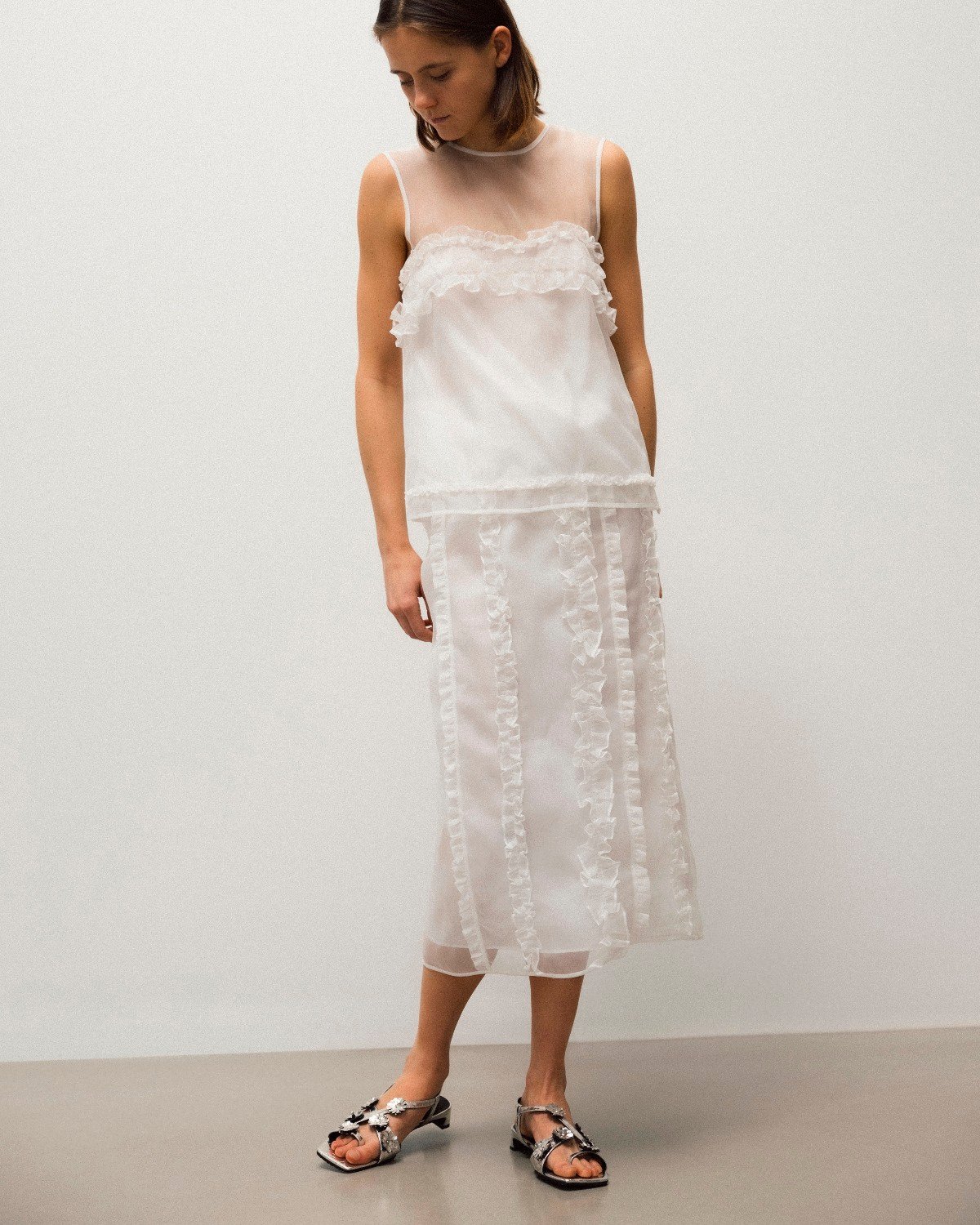 Introducing the Orietta Top, a captivating fusion of sophistication and femininity. This sleeveless top is adorned with intricate ruffle details along the bust and near the hem, adding a touch of whimsy and romance to the silhouette. Inner lining under the bust creates a striking contrast and highlights the intricate design.