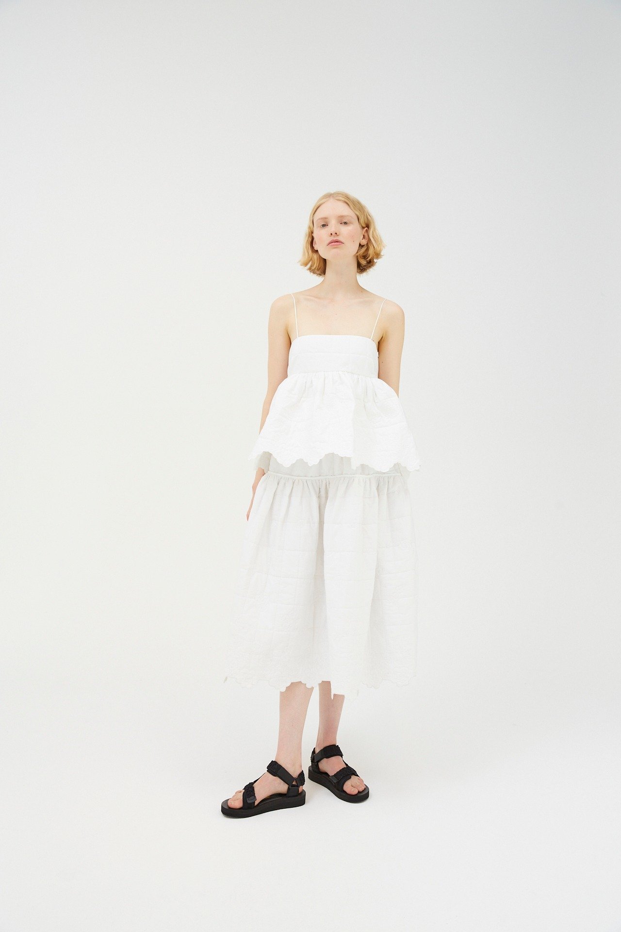 The Rosie is a showcase for Cecilieís couture handwork, crafted in patchwork quilted organic cotton, embroidered roses nesting into the scalloped hemline. This style is part of EDITION, a collection of signature pieces from past seasons. Your garment will come with a unique QR code on the care label, directing you to your digital Certificate of Authenticity.