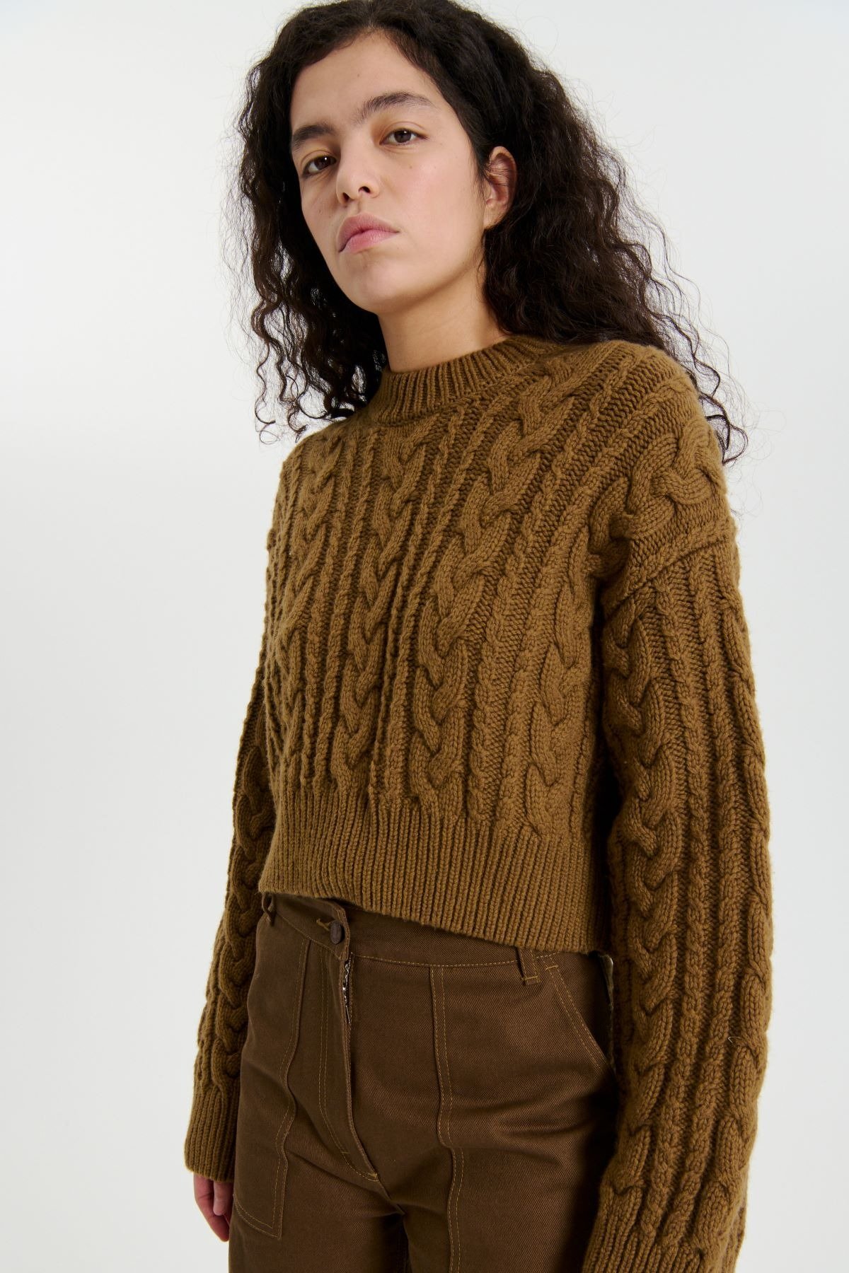 A counterpoint to light and ultra-feminine silhouettes, the Vibeke jumper in light brown. The boxy fisherman knit offers weight and substance made to pair with romantic volumes.