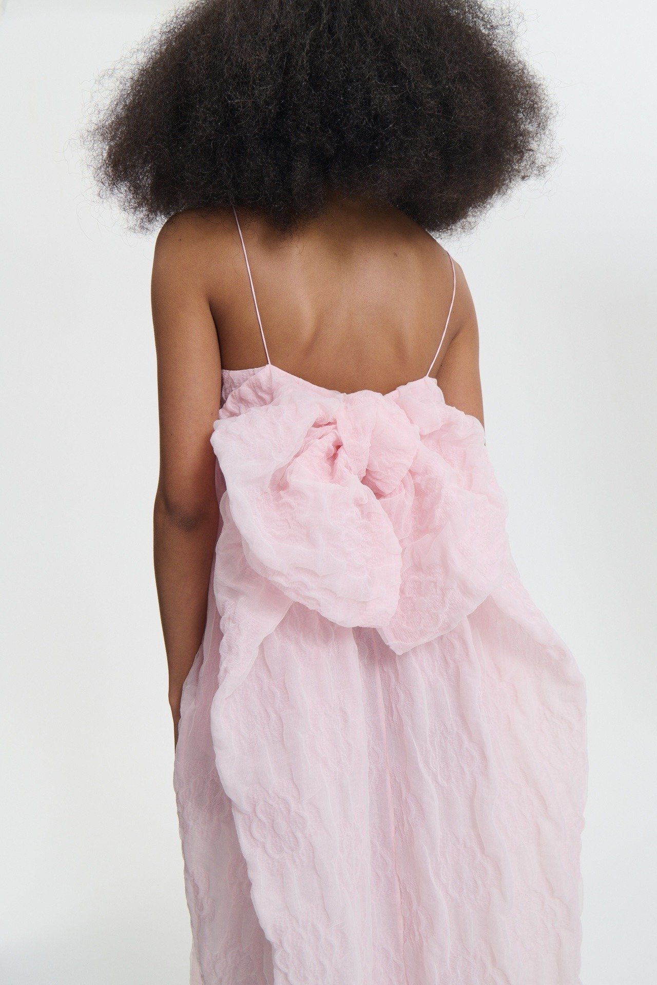 An expression of effortless femininity, the Vilma dress. Crafted from a white/blush pink avens matelassé, the minimalist silhouette balances a narrow bandeau with an airy skirt that grazes the ankle. Finished with an oversized bow across the back and a zip closure.